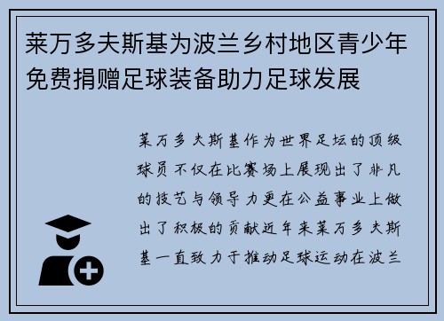 罗伯特·莱万多夫斯基是现代足球界的超级巨星,以其卓越的进球能力和全面的技术水平赢得了全球球迷的尊敬。作为波兰的足球代表人物,莱万多夫斯基不仅在俱乐部比赛中取得了巨大的成就,还在国际赛场上为波兰国家队做...